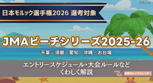 2024-25「JMAビーチシリーズ」年にかけて開催される「JMAビーチシリーズ」の大会情報・結果です。砂浜でプレーするビーチモルックの大会群であり、大会ごとに付与される順位ポイントのシーズン合計上位2位に入ると、2025年6月に開催される日本選手権に進むこ…